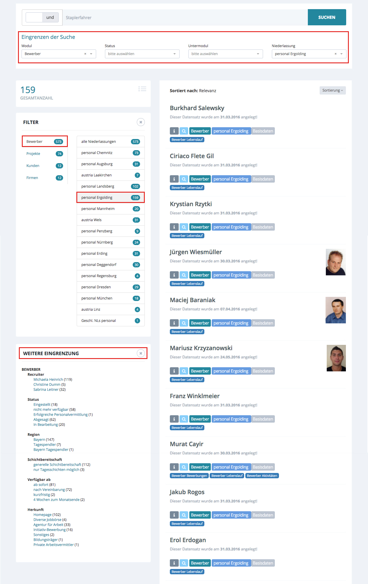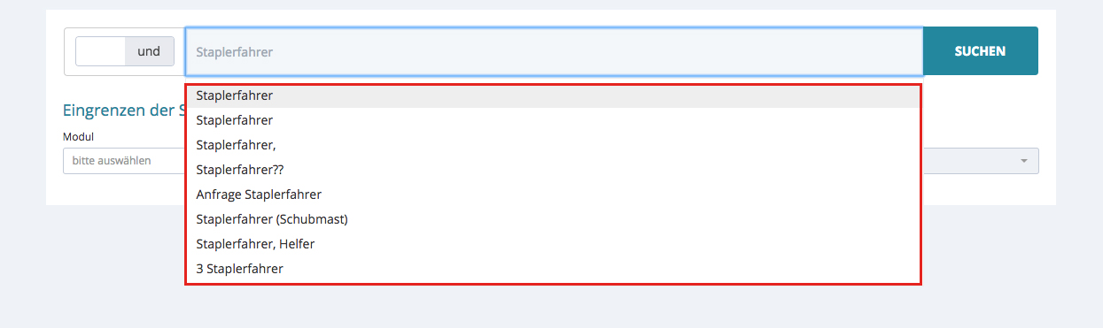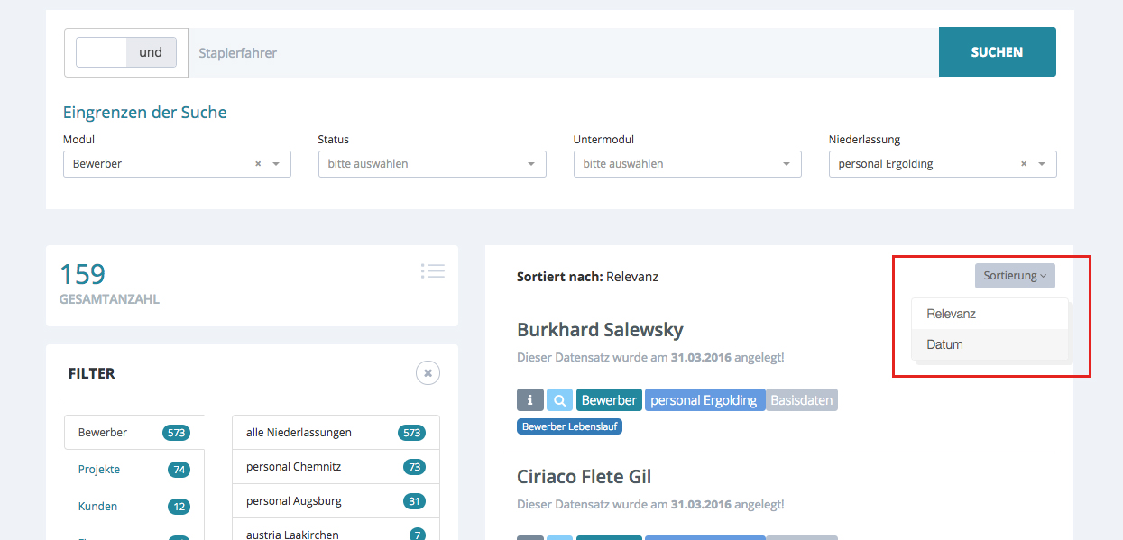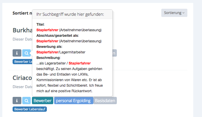 Auf der rechten Seite werden Ihnen alle Ergebnisse angezeigt. Sie können diese nach Relevanz und nach Datum sortieren. Bei der Sortierung nach Relevanz werden die Datensätze nach Häufigkeit des enthaltenen Suchbegriffes angezeigt. In diesem Beispiel wurde „Staplerfahrer“ gesucht und im ersten Treffer ist 4x das Wort Staplerfahrer enthalten. Die Sortierung nach Datum richtet sich danach, wann der Datensatz angelegt wurde und beginnt mit dem neusten Eintrag. (Dies wird Ihnen nun in dem Lupen-Icon angezeigt.)