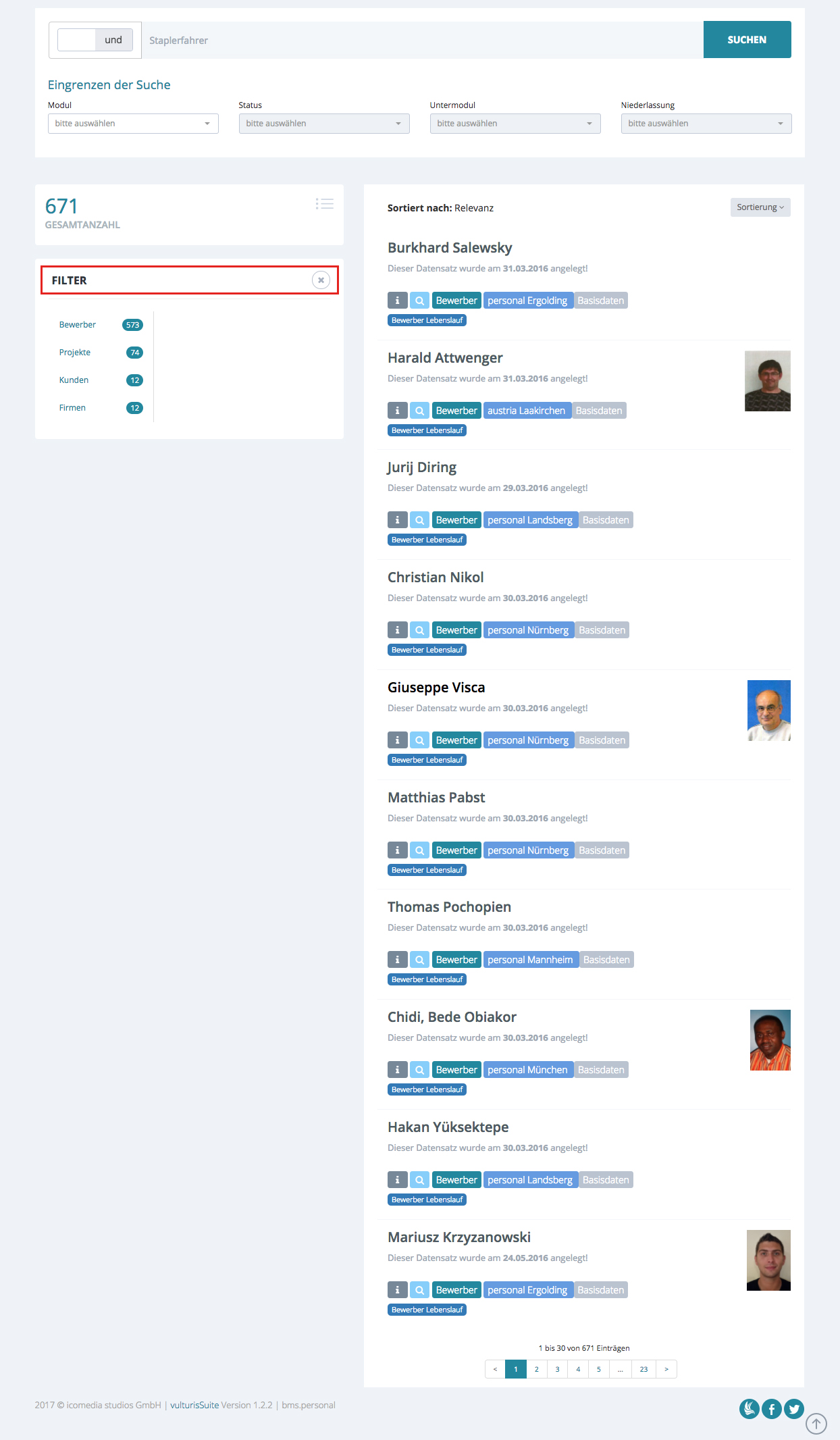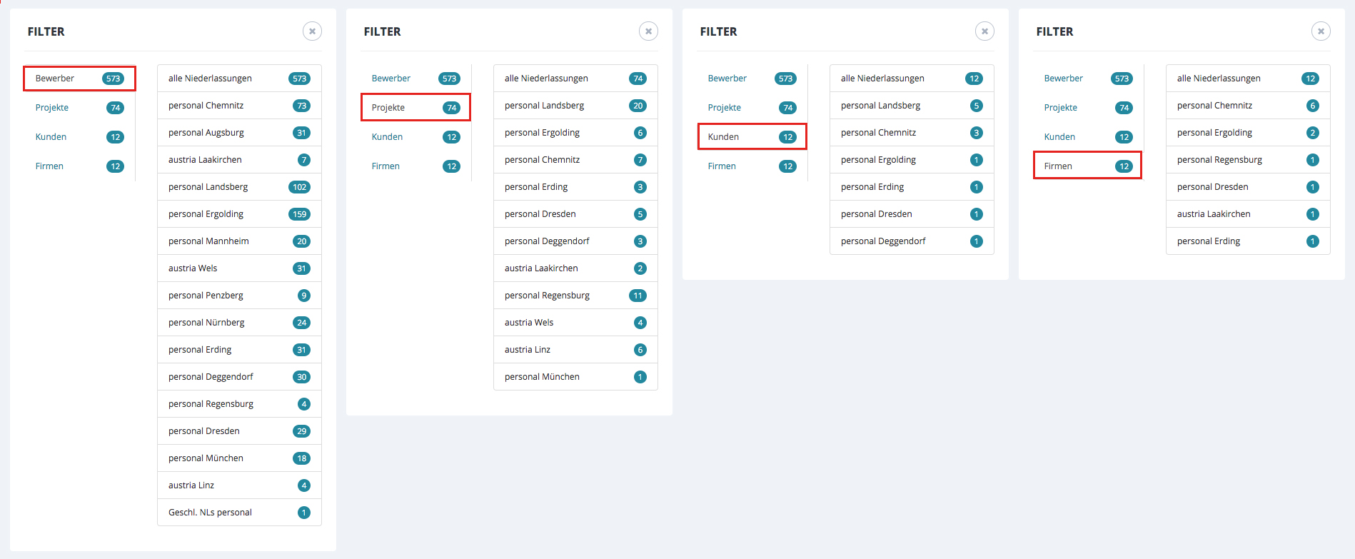 Im Filter wird angezeigt, wie viele Ergebnisse davon im Bereich Projekte, Kunden und Bewerber gefunden wurden.