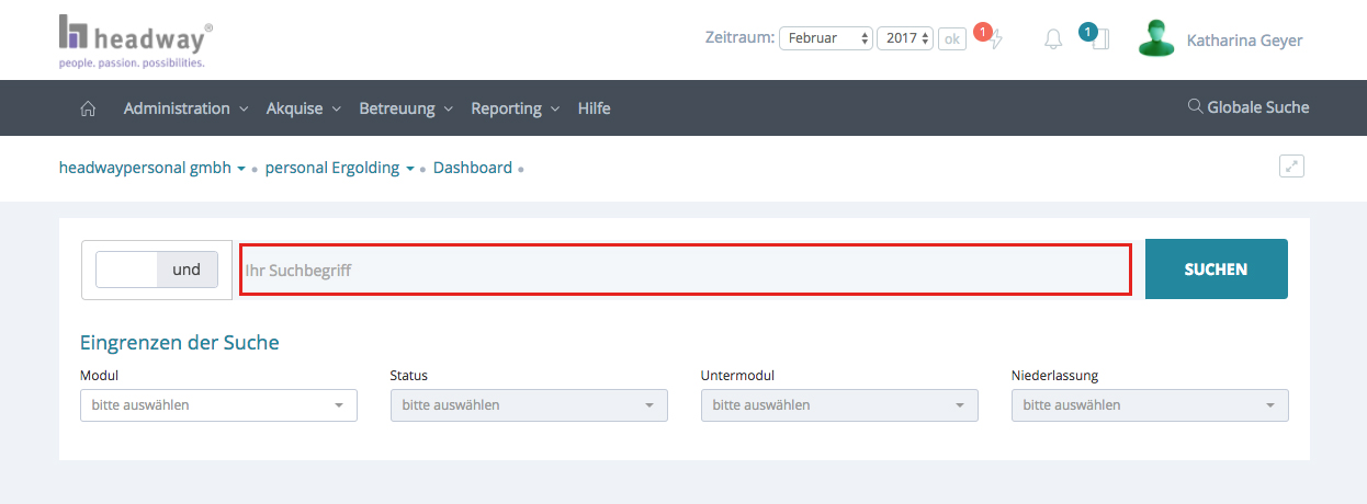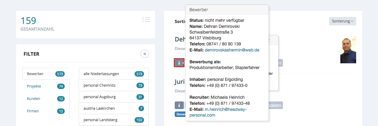 Mit der globalen Suche können Sie ausnahmslos alle Firmen und Niederlassungen nach Kunden, Projekten,Bewerbern und Firmen durchsuchen. Völlig unabhängig ob diese Daten nur bestimmten Niederlassungen zugeteilt sind.