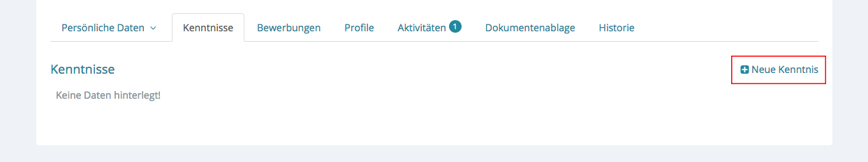 Es erscheint das leere Formular Kenntnisse. Klicken Sie nun unten rechts auf „+ Neue Kenntnis“ um diese zu hinterlegen.