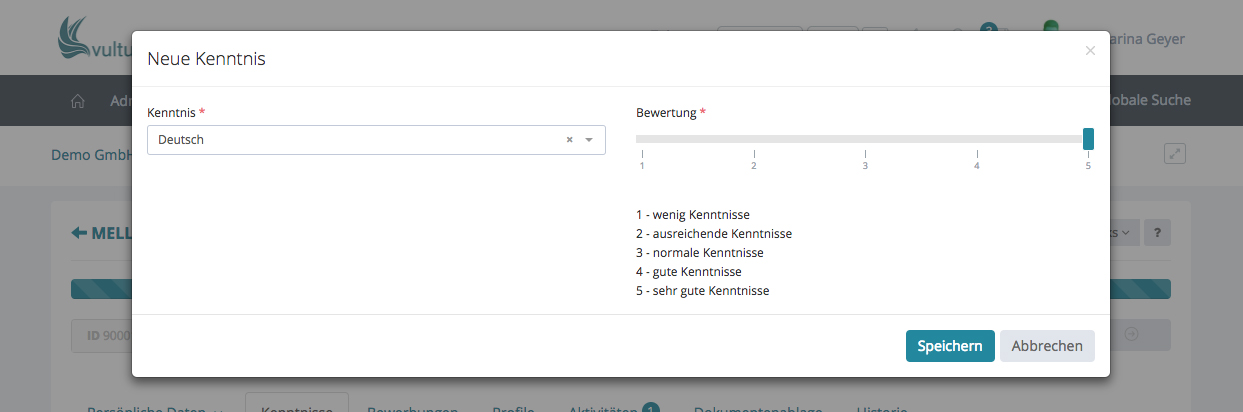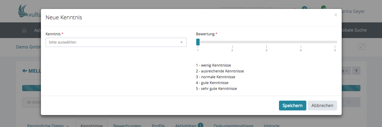 Geben Sie nun die Kenntnisse ein und bewerten Sie diese. Durch ein Klick in das Kenntnissfeld öffnet sich ein Drop-down-Menü, sie können aber auch direkt hinein schreiben, um die Kenntnisse zu finden oder um zu sehen ob sie überhaupt hinterlegt ist. Bewegen Sie anschließend den Regler mit der gedrückten Maustaste und vergeben eine Bewertung.