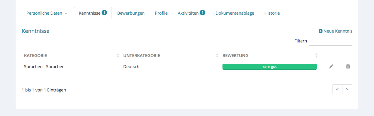 Nach dem „Speichern“ erscheinen die Kenntnisse in der Übersicht. Sie können diese jederzeit überarbeiten, indem Sie auf den Stift klicken oder ihn löschen, indem Sie auf den Papierkorb klicken.
