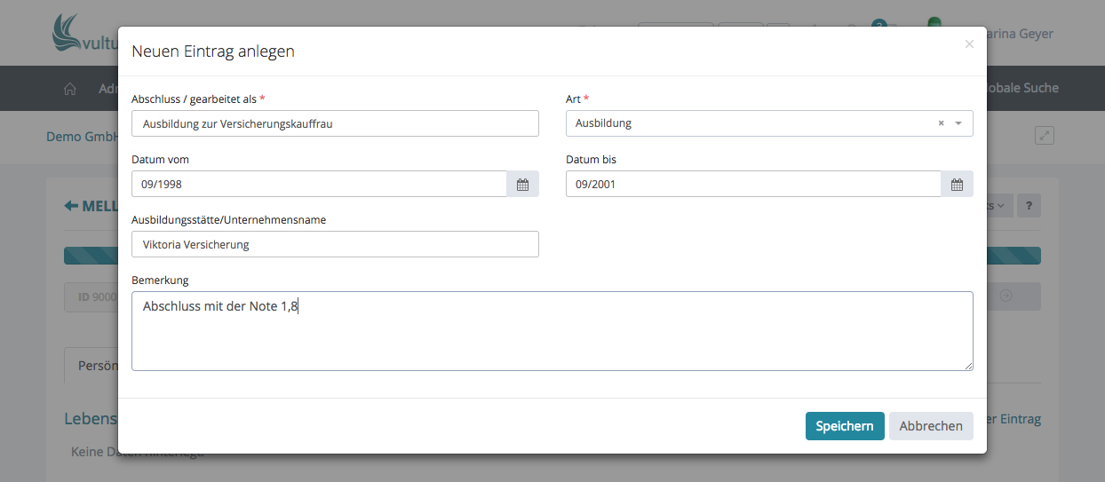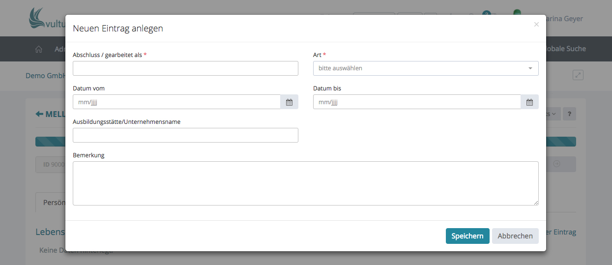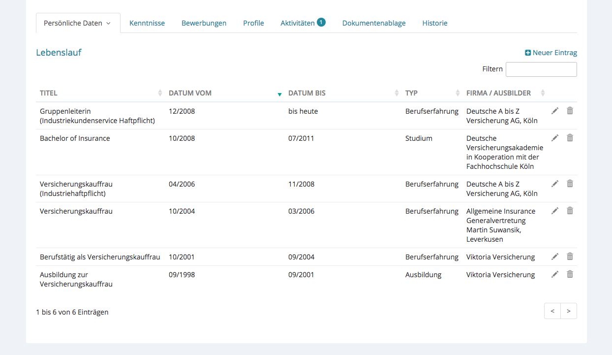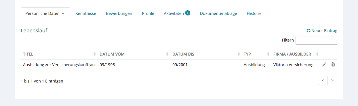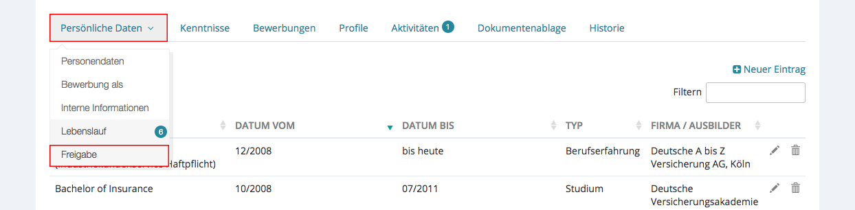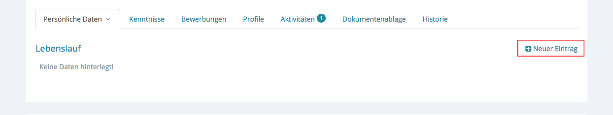 Klicken Sie nun unten rechts auf „+ Neuer Eintrag“ um die wichtigsten Daten aus dem Lebenslauf zu hinterlegen.