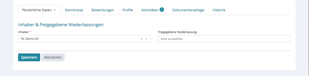 Da der Bewerber zu Ihrer Niederlassung gehört, werden Sie auch als Inhaber geführt. Wenn Sie auf der rechten Seite unter „freigebenen Niederlassung“ nun eine auswählen und speichern, taucht dieser Bewerber nun auch in dieser NL auf. Dann verfügt diese NL genau wie Ihre über alle Möglichkeiten (Lese- und Schreibrechte).