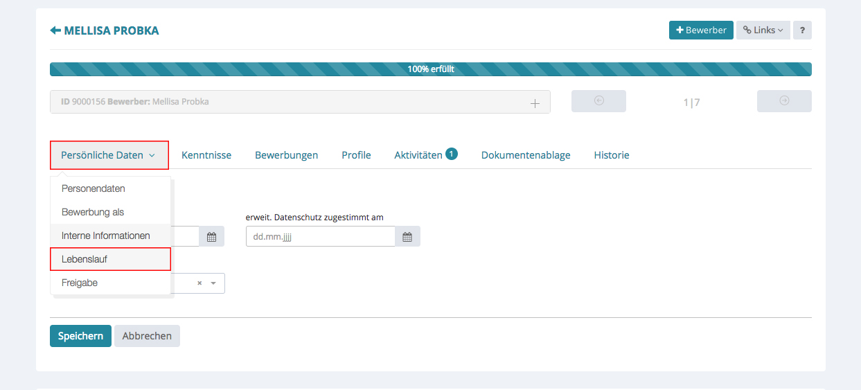 Es gibt zwei Möglichkeiten an dieser Stelle. Zum einen, das selbst Anlegen der Einträge. Dies kann notwendig sein, wenn der Lebenslauf des Bewerbers vom „Reader“ nicht gelesen werden kann. Dies ist passiert, wenn der Lebenslauf nicht in den gängigen Formaten (pdf, word, jpg) gespeichert wurde.