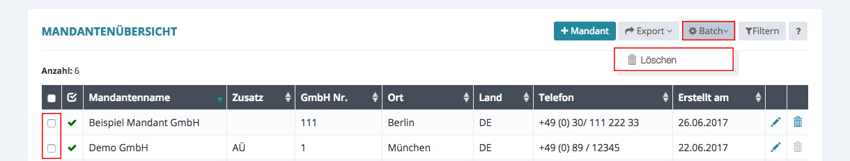 Es gibt die Möglichkeit mehrere Mandanten in der Übersicht gleichzeitig auszuwählen, um sie dann zu löschen, indem sie ganz links über die Kästchen angeklickt werden. Danach auf den Batch-Button oben rechts klicken und löschen auswählen.