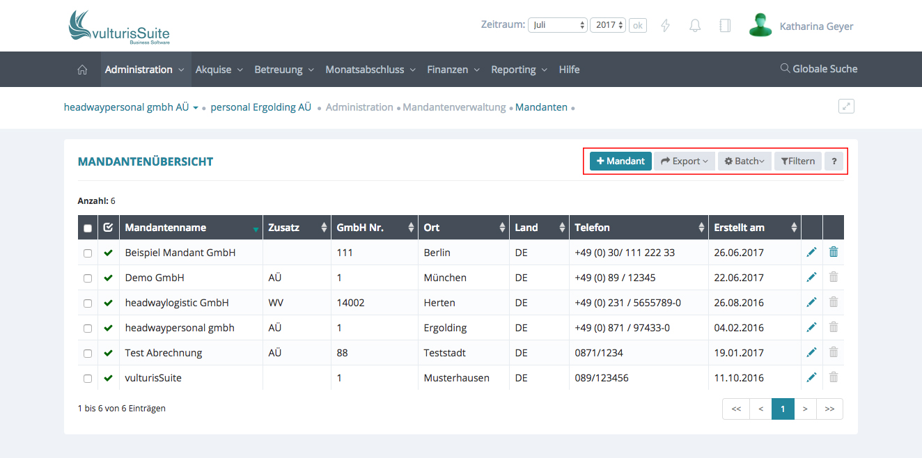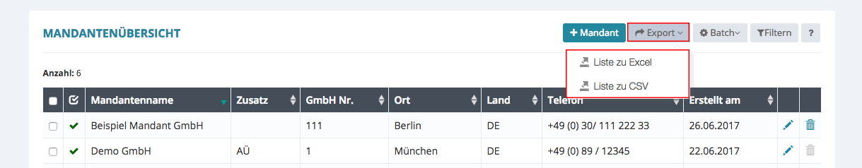 Hier werden Ihnen alle eingetragenen Mandanten angezeigt.