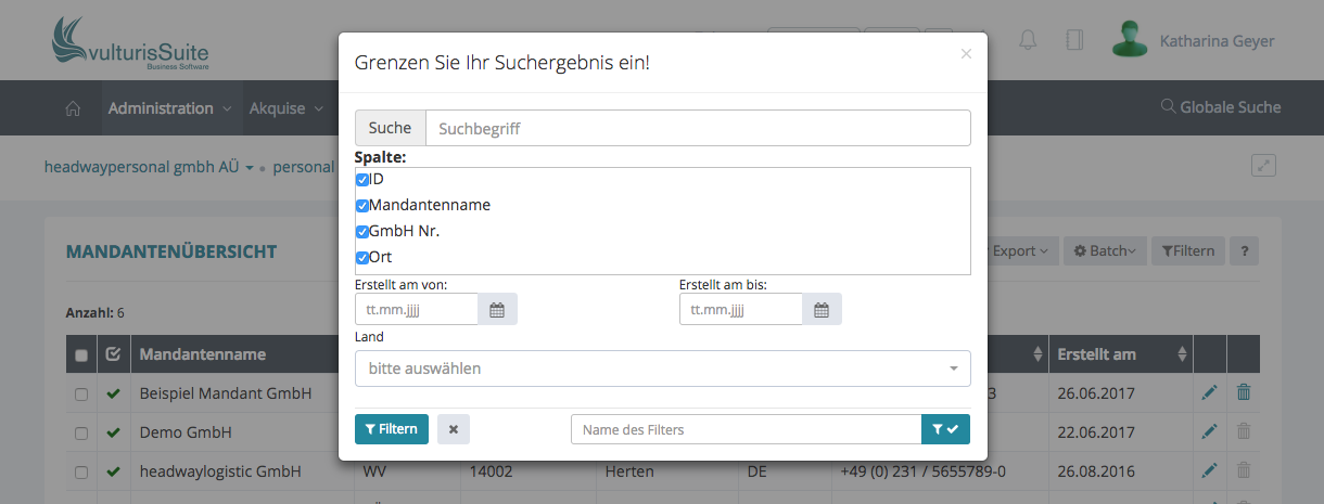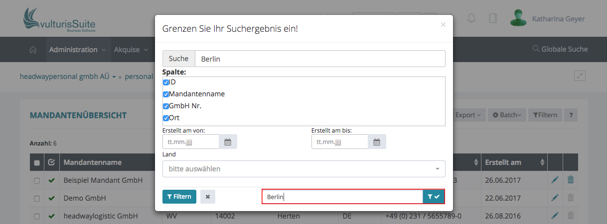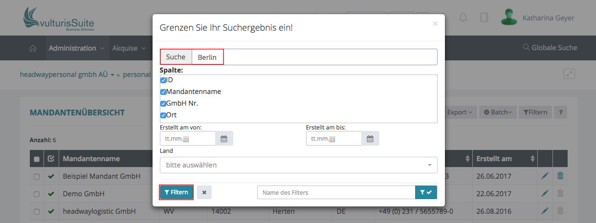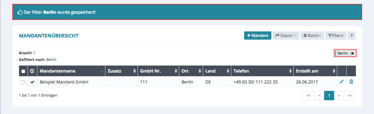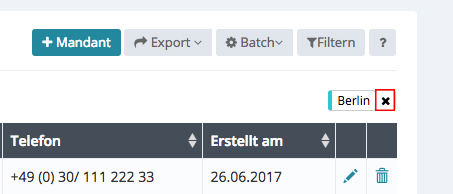 Suchen Sie z.B. alle Mandanten in Berlin, geben Sie bei Suche „Berlin“ ein, oder auch nur „Ber“, klicken Sie anschließend unten links auf Filtern.