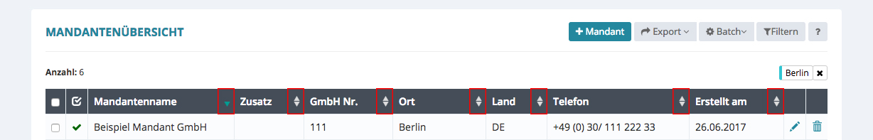 Hier besteht die Möglichkeit, einen Suchbegriff direkt einzugeben und die Liste danach zu filtern. Ein Sortieren nach Mandantenname, Ort oder Telefon ist ebenfalls möglich. Die Spalten können via Klick auf den Spaltennamen sortiert werden. Die Pfeile zeigen die Reihung auf- oder absteigend an.