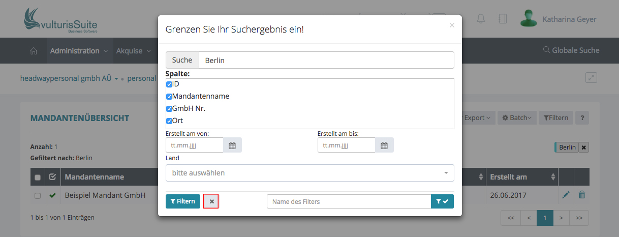 Suchen Sie z.B. alle Mandanten in Berlin, geben Sie bei Suche „Berlin“ ein, oder auch nur „Ber“, klicken Sie anschließend unten links auf Filtern.