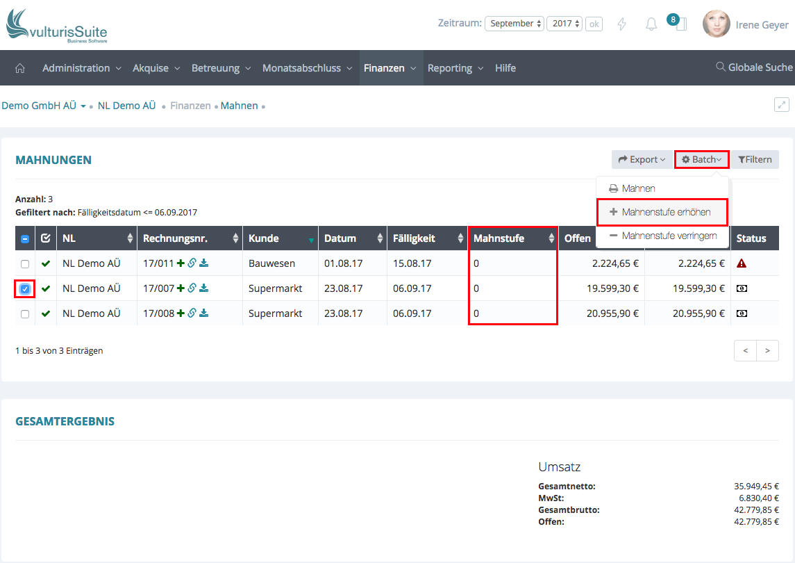 Setzten Sie ein Häkchen bei den Rechnungen, wo die Mahnstufe verändert werden soll. Dann klicken Sie auf den Button „Batch“. Es erscheint neben den Punkt „Mahnen“ auch die Menüpunkte „+ Mahnstufe erhöhen“ und „- Mahnstufe verringern“. In diesem Beispiel wird die Mahnstufe erhöht.