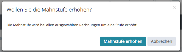 Mit einem Klick auf den Menüpunkt „+ Mahnstufe erhöhen“ wird noch einmal gefragt ob die Stufe erhöht werden soll.