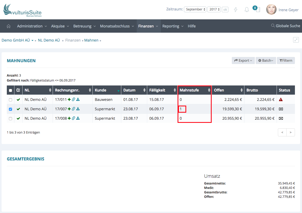 Nach der Bestätigung schließt sich das Fenster und in der Spalte „Mahnstufe“ wurde die Mahnstufe erhöht.