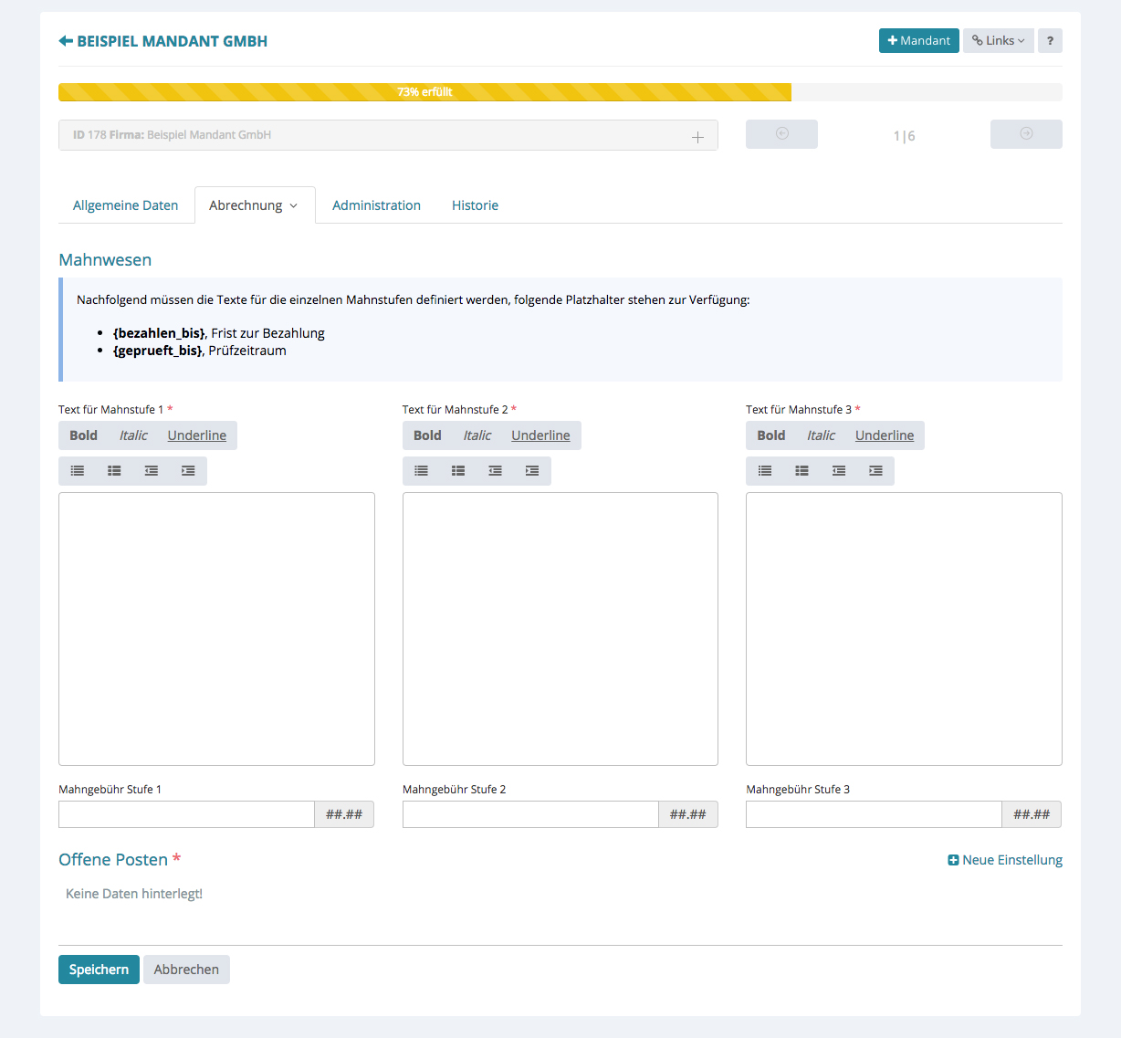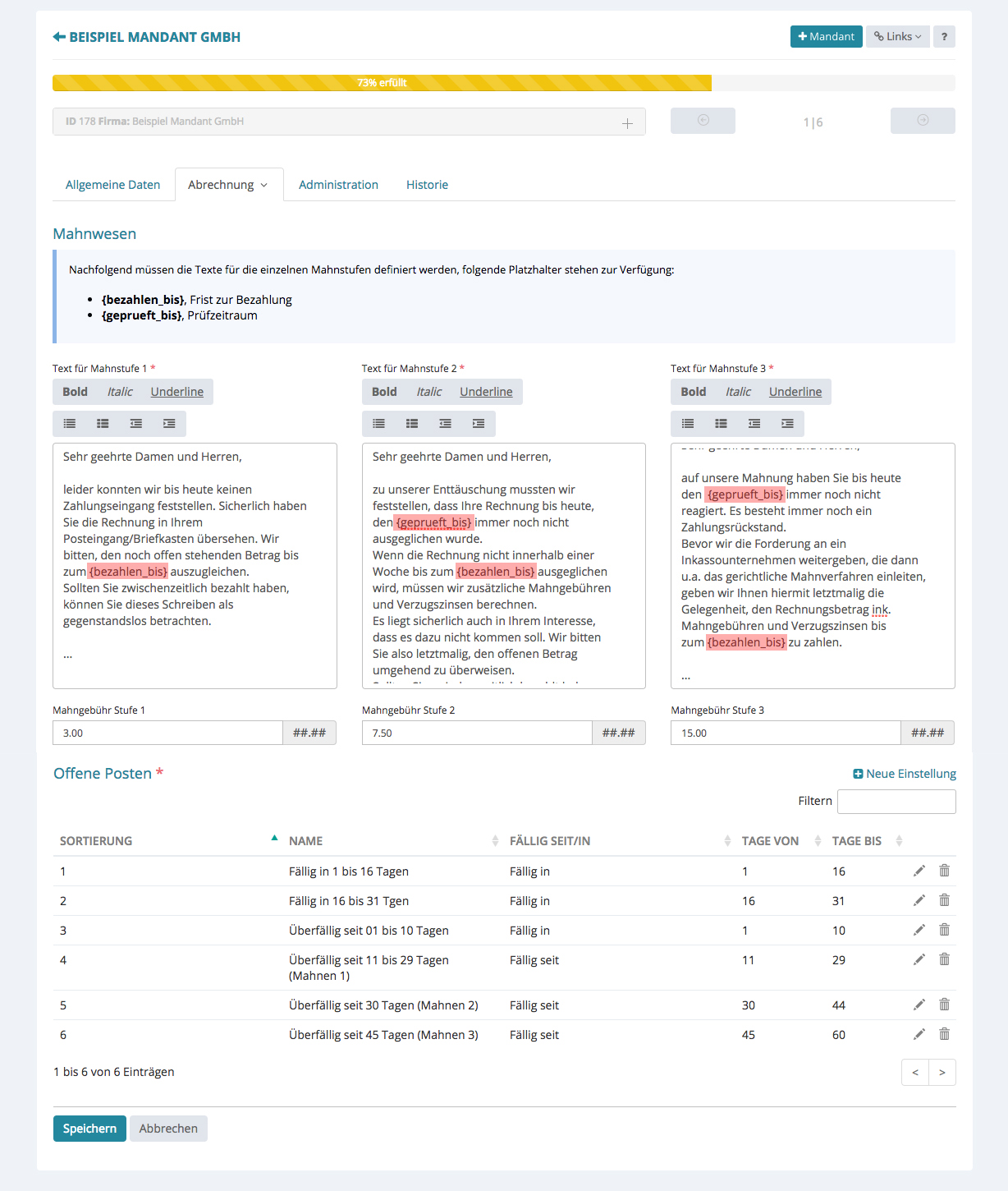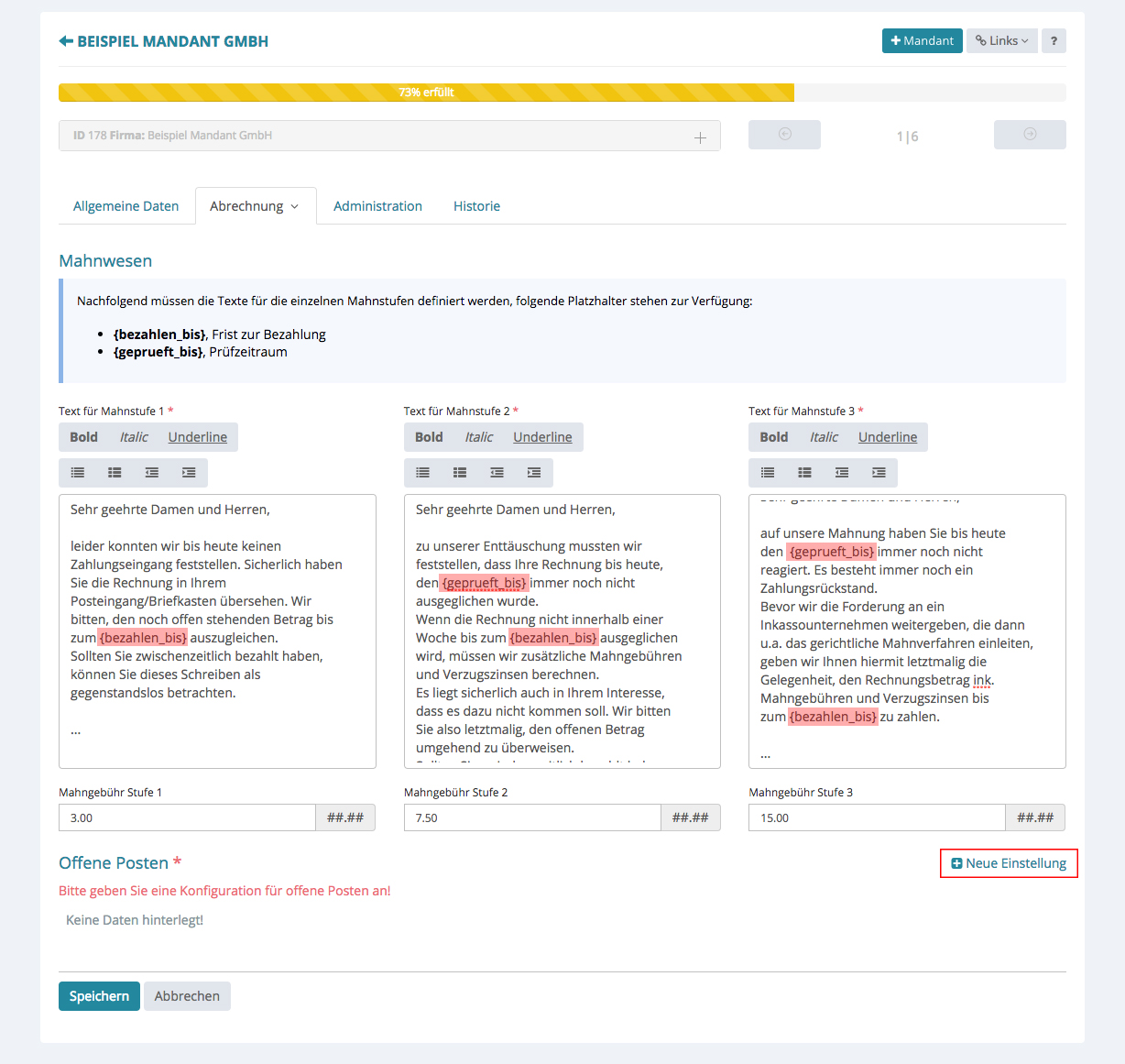 Sie können hier die Texte für die unterschiedlichen Mahnstufen hinterlegen und die offenen Posten festlegen.