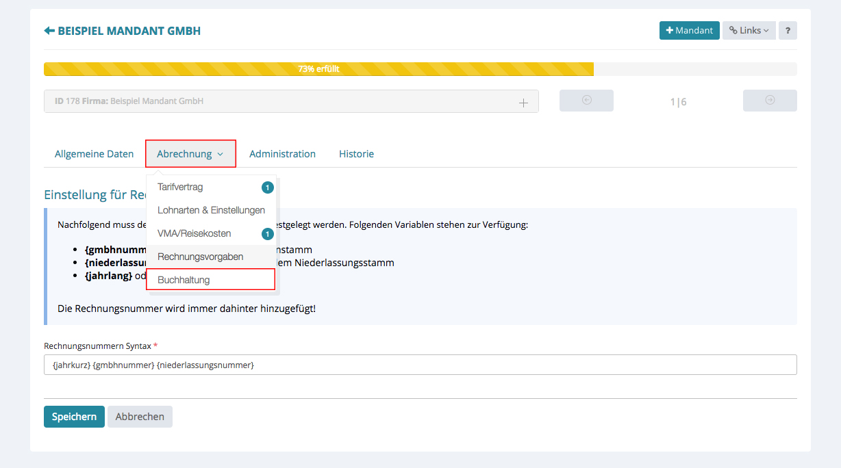 Wählen Sie im beim Mandanten den Reiter „Abrechnung“ und klicken auf „Buchhaltung“.
