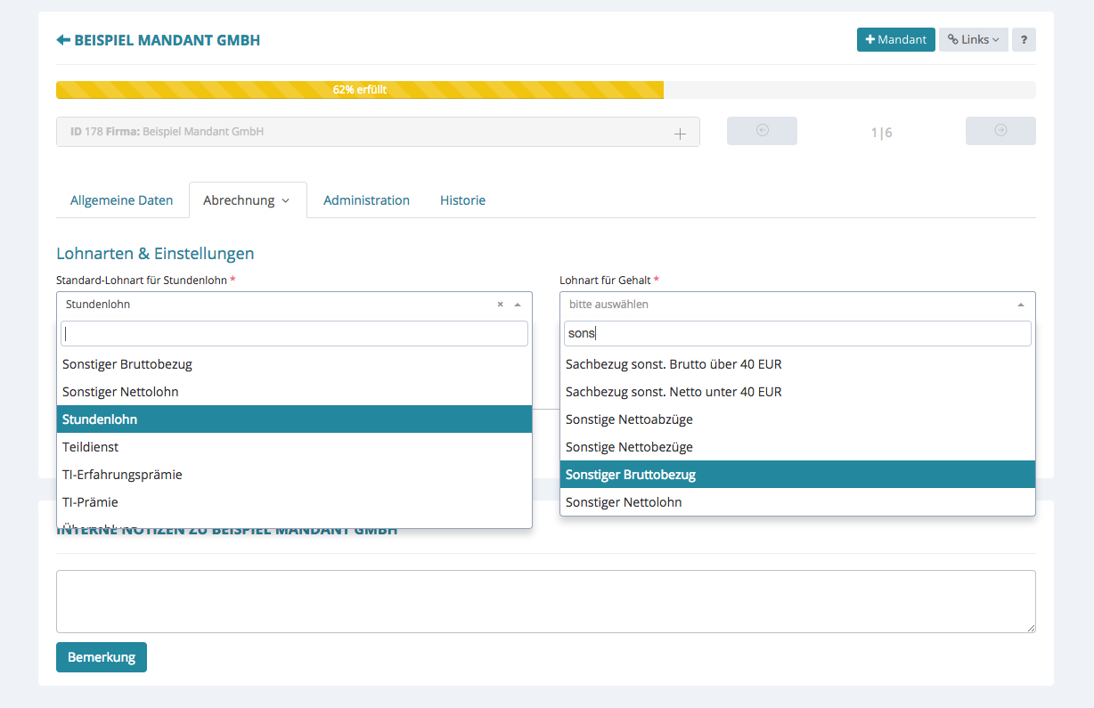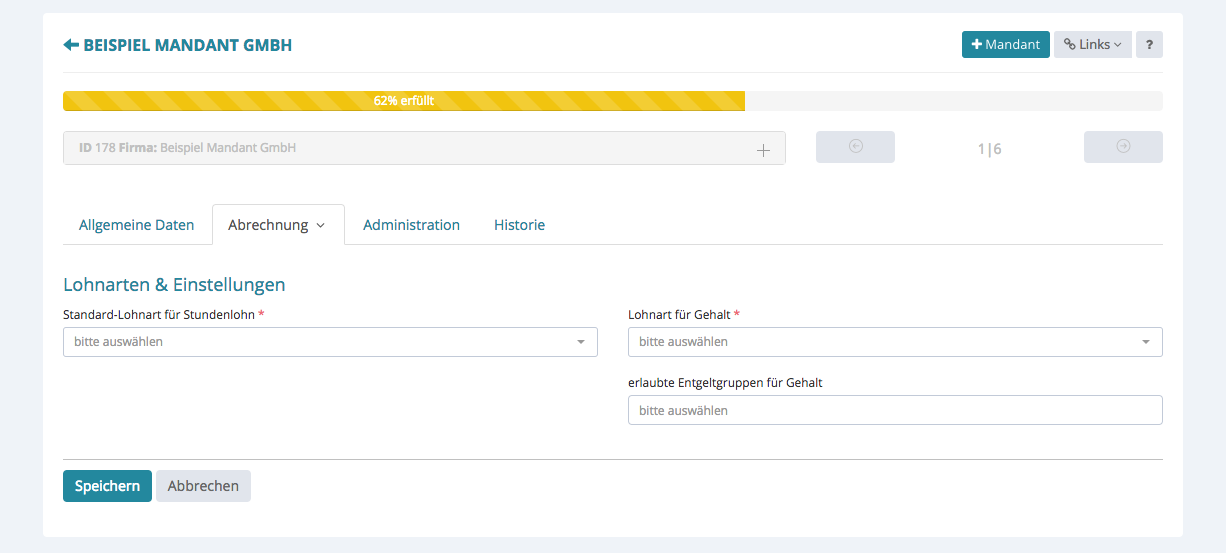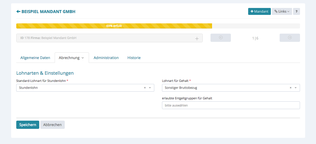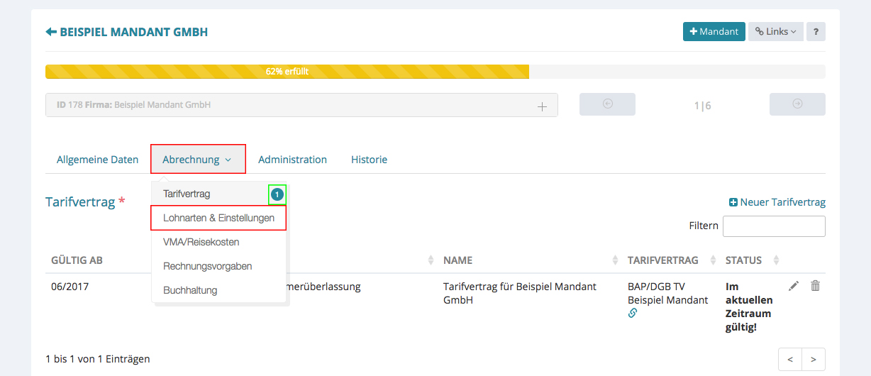 (Die 1, hinter Tarifvertrag, steht dafür, dass ein Tarifvertrag dem Mandanten zugeordnet wurde.)