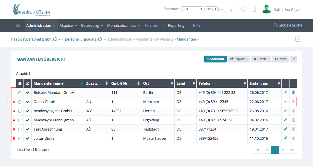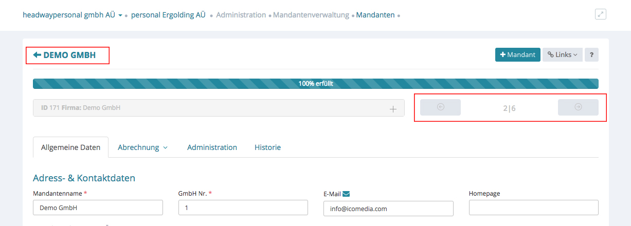 In diesem Fall ist der zweite Mandant aus der Übersichtsseite die „Demo GMBH“. Von dort aus können Sie entweder zu Mandant Nr. 3 weiter springen, oder wieder zurück zu Mandant Nr.1.