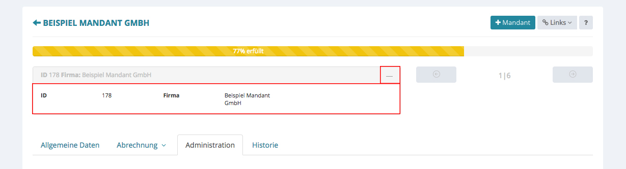 Wie bei jedem Datensatz gibt es auch beim Mandanten eine ausklappbare Übersicht mit wichtigen Eckdaten. Diese kann ausgeklappt werden, indem Sie auf das Plus klicken und wieder zuklappen, indem Sie auf das Minus klicken.