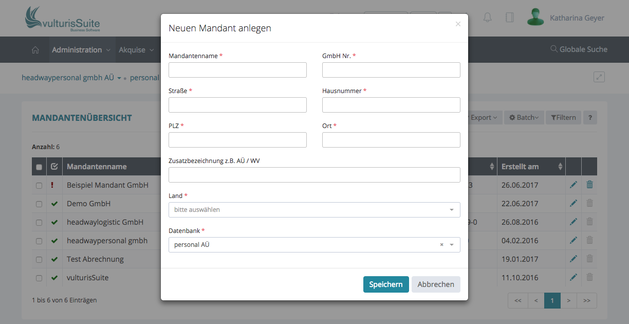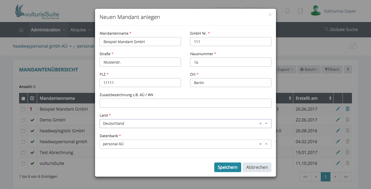 Ein Klick auf diesen Button „+ Mandant“ und ein Schnelleingabefenster öffnet sich.