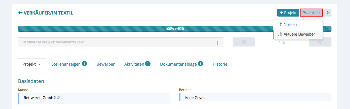 Viele Datensätze sind untereinander verlinkt (verknüpft). Wie z.B. angelegte Projekte oder Anfragen mit der aktuellen Bewerberübersicht auf diese/s eine Projekt/Anfrage.