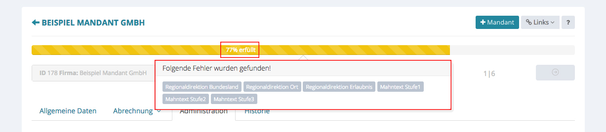 Aber in diesem Beispiel sind wir im Übersichtsbalken erst bei 77%. Es kann also noch ordnungsgemäß abgerechnet werden. Was fehlt? Klicken Sie mit der linken Maustaste auf den Balken. Darunter wird dann angezeigt, wo Pflichteingaben fehlen. Mit einem weiteren links Klick auf den Balken verschwindet dieser Hinweis wieder.