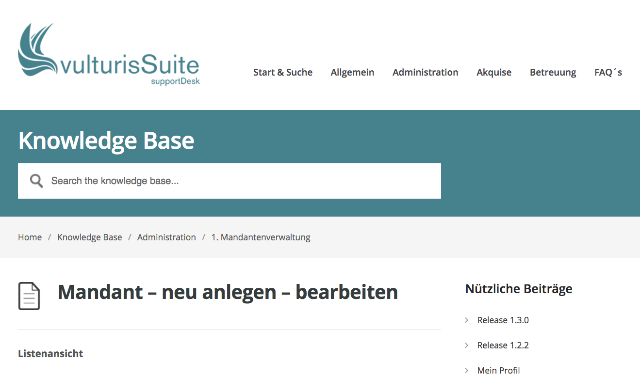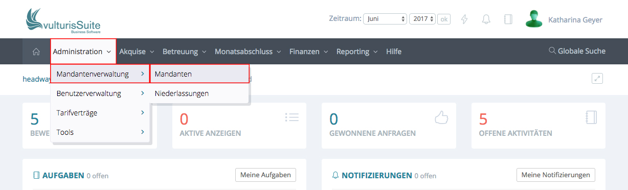 In der obersten Reihe befindet sich die Übersicht dessen, wo Sie sich gerade befinden. Möchten Sie zu der Übersicht der Mandanten zurück, klicken Sie dort auf Mandanten.
