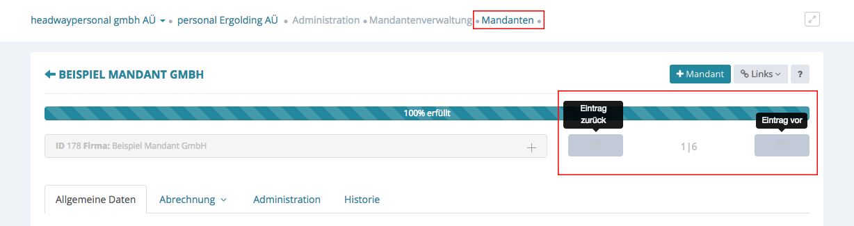 Möchten Sie einfach zum nächsten Mandanten aus der Übersicht springen, klicken Sie auf die Pfeile „Eintrag zurück“ oder „Eintrag vor“.