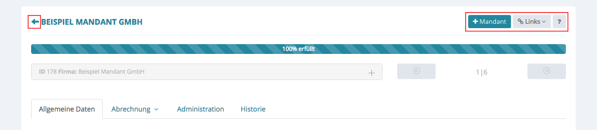 In der obersten Reihe befindet sich die Übersicht dessen, wo Sie sich gerade befinden. Möchten Sie zu der Übersicht der Mandanten zurück, klicken Sie dort auf Mandanten.