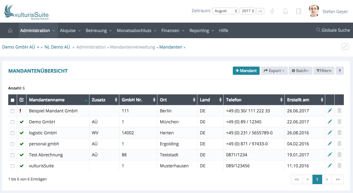 Hier werden Ihnen alle bis dahin eingetragenen Mandanten angezeigt.