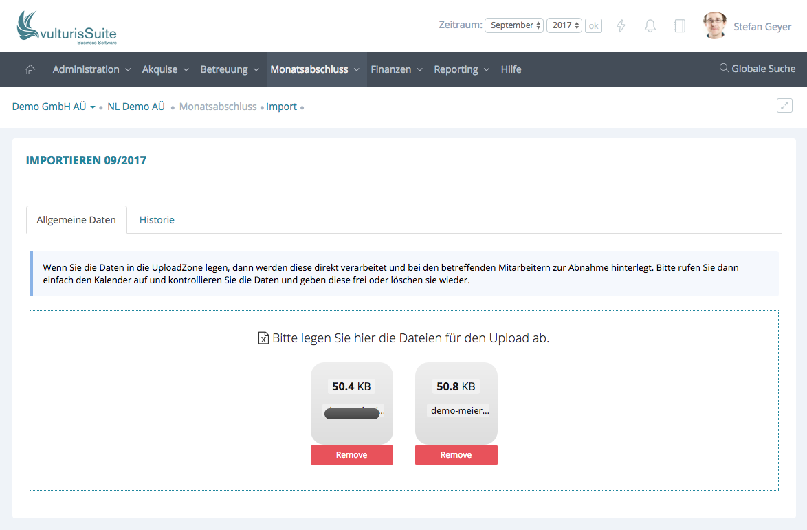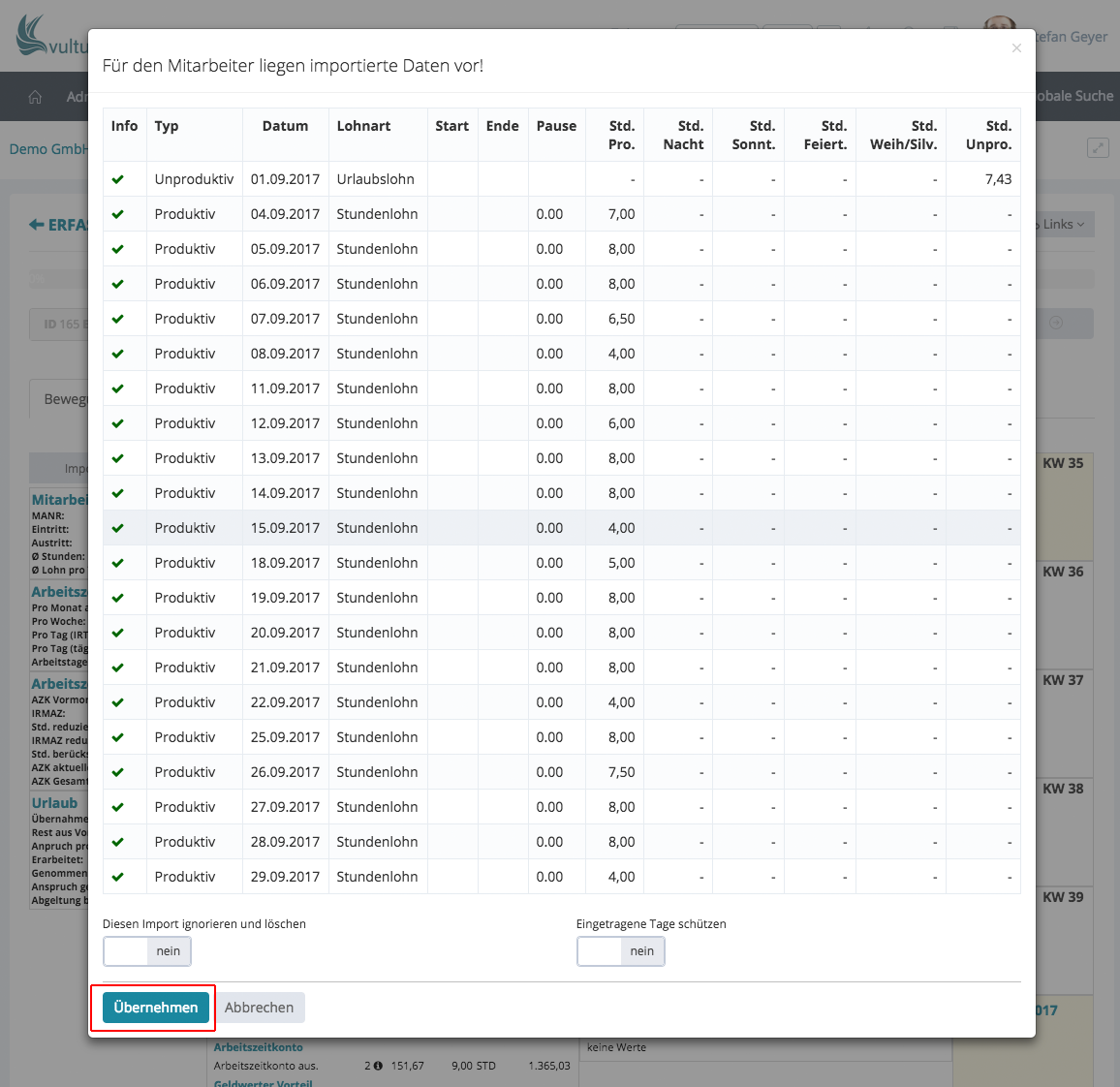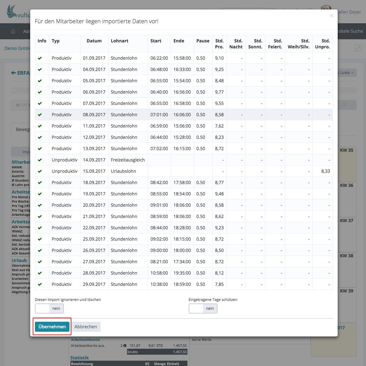 So können Sie beliebig viele Mitarbeiter durchgehen und den Import der Daten abschliessen. Es müssen nicht alle Mitarbeiter zur gleichen Zeit abgeschlossen werden, der Import für den Monat wird sich solange gemerkt bis er übernommen oder gelöscht wurde.