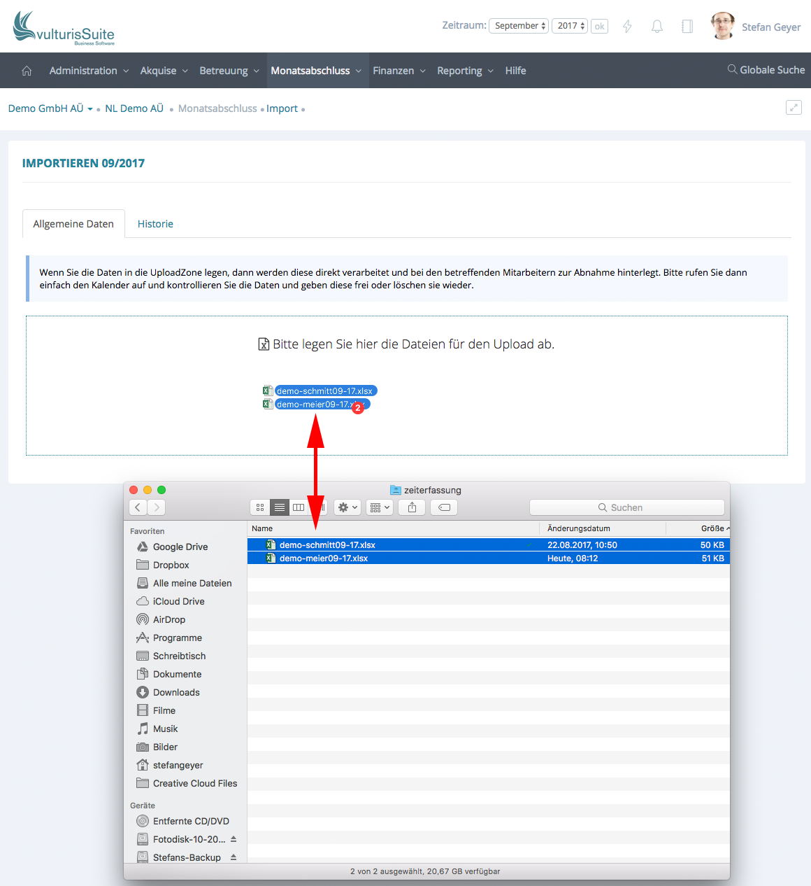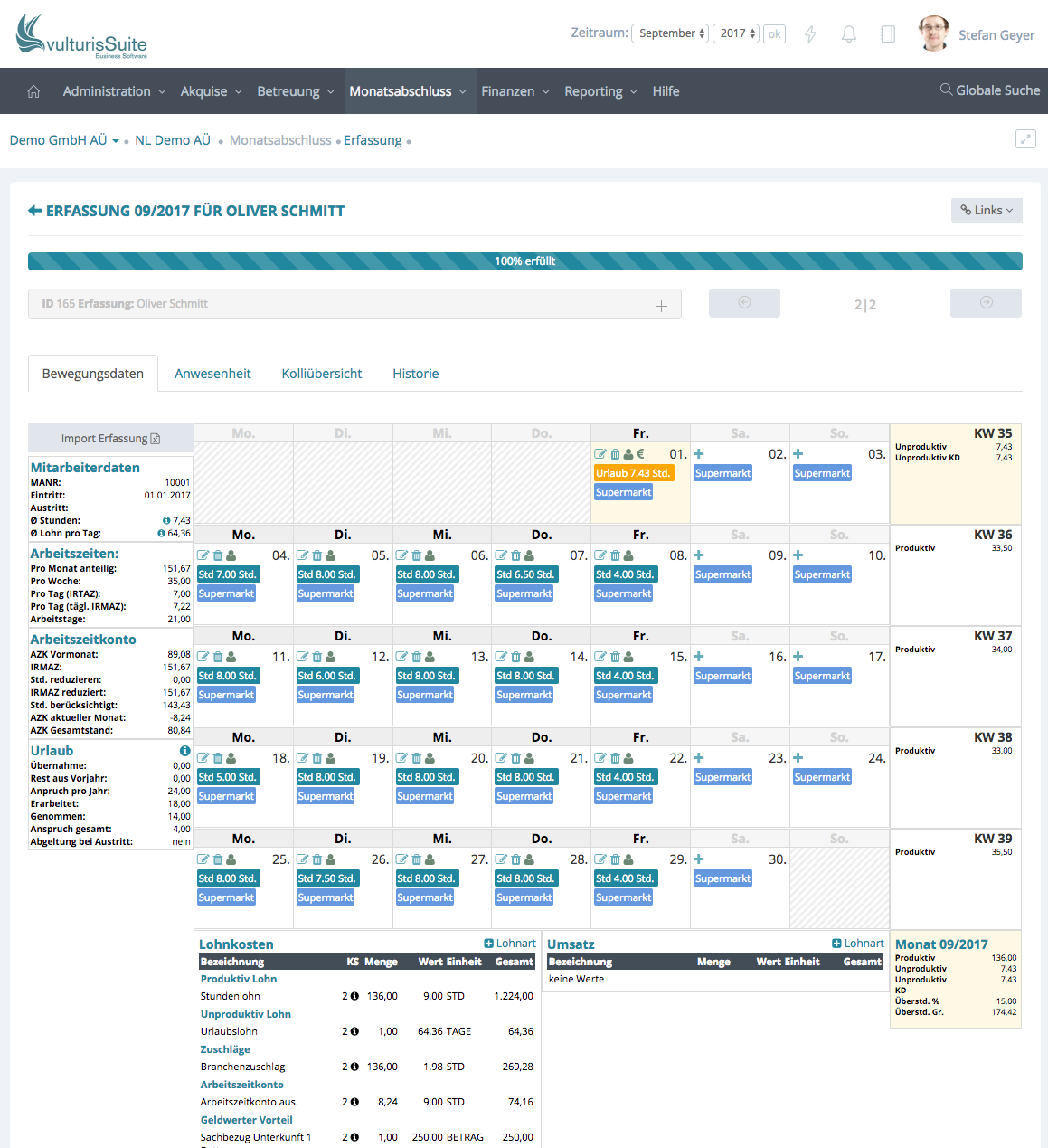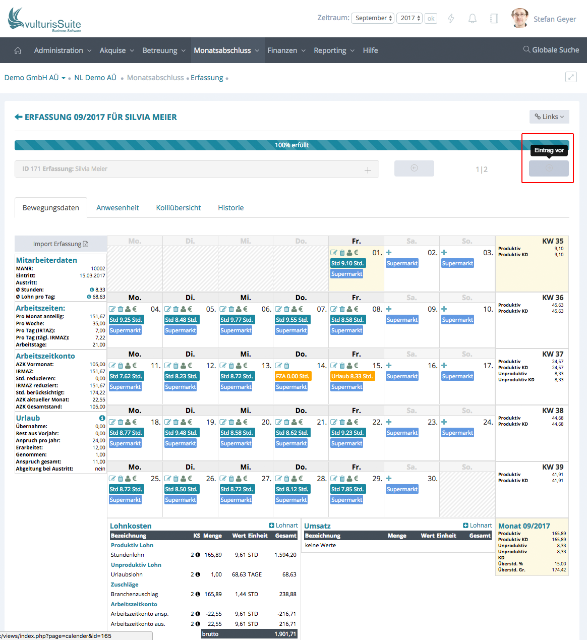 So können Sie beliebig viele Mitarbeiter durchgehen und den Import der Daten abschliessen. Es müssen nicht alle Mitarbeiter zur gleichen Zeit abgeschlossen werden, der Import für den Monat wird sich solange gemerkt bis er übernommen oder gelöscht wurde.