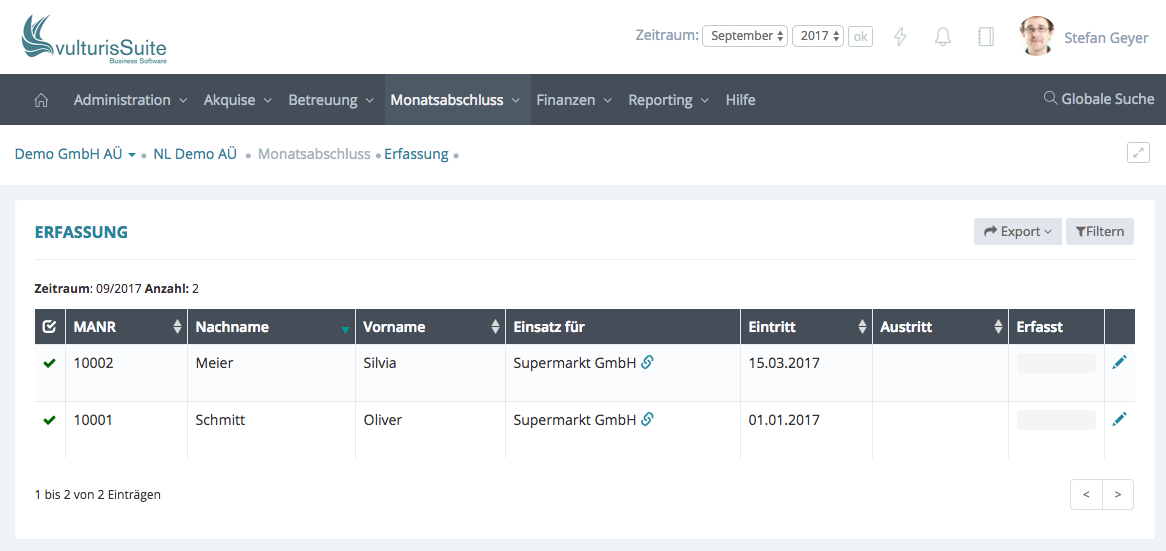 4. Nachdem der Import abgeschlossen ist, wechseln Sie bitte in zum Modul „Monatsabschluss“ – „Erfassung“.