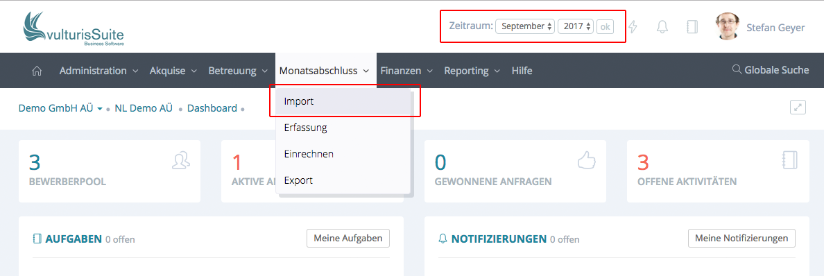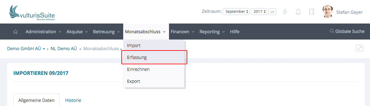 4. Nachdem der Import abgeschlossen ist, wechseln Sie bitte in zum Modul „Monatsabschluss“ – „Erfassung“.