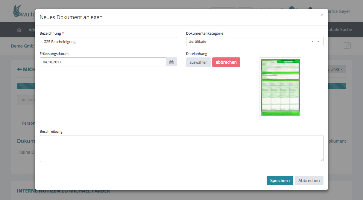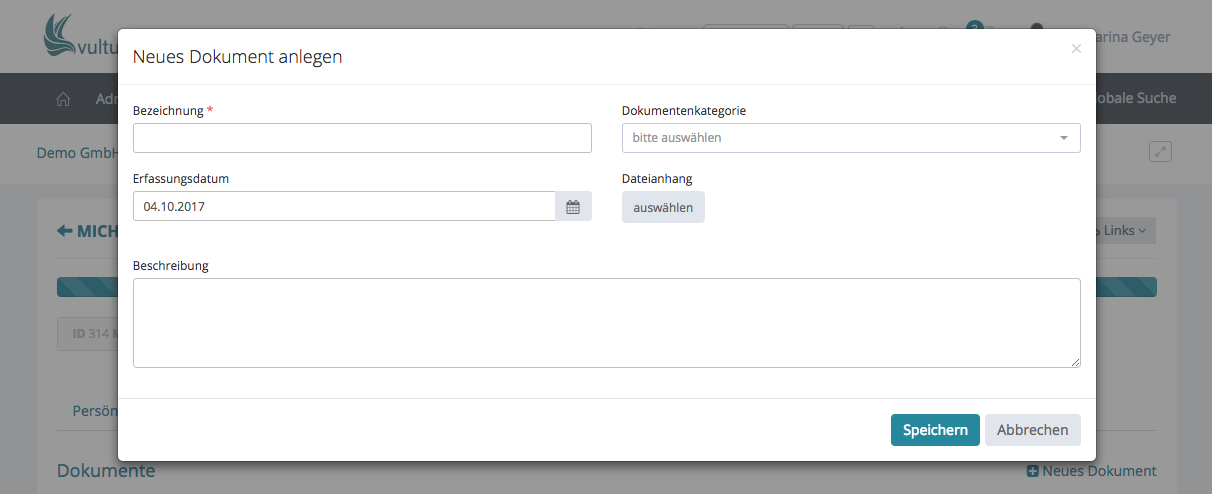 Als erstes vergeben Sie bitte einen Namen für das Dokument und ordnen es der passenden Kategorie zu. Anschließend das Datum eintragen, wann es verschickt wurde. (Benötigen Sie Hilfe bei der Kalenderfunktion, schauen Sie sich an, wie die Datumseingabe funktioniert.) Mit einem Klick auf „Dateianhang auswählen“, können Sie das Dokument hochladen (nur eins pro Vorgang und nicht größer als 5 MB). Geben sie gerne noch eine kurze Beschreibung ein und klicken anschließend auf Speichern. Möchten Sie mehrere Dokumente gleichzeitig hochladen, wird Ihnen hier der Vorgang erklärt: Aktivitäten – E-Mail direkt ans System weiterleiten