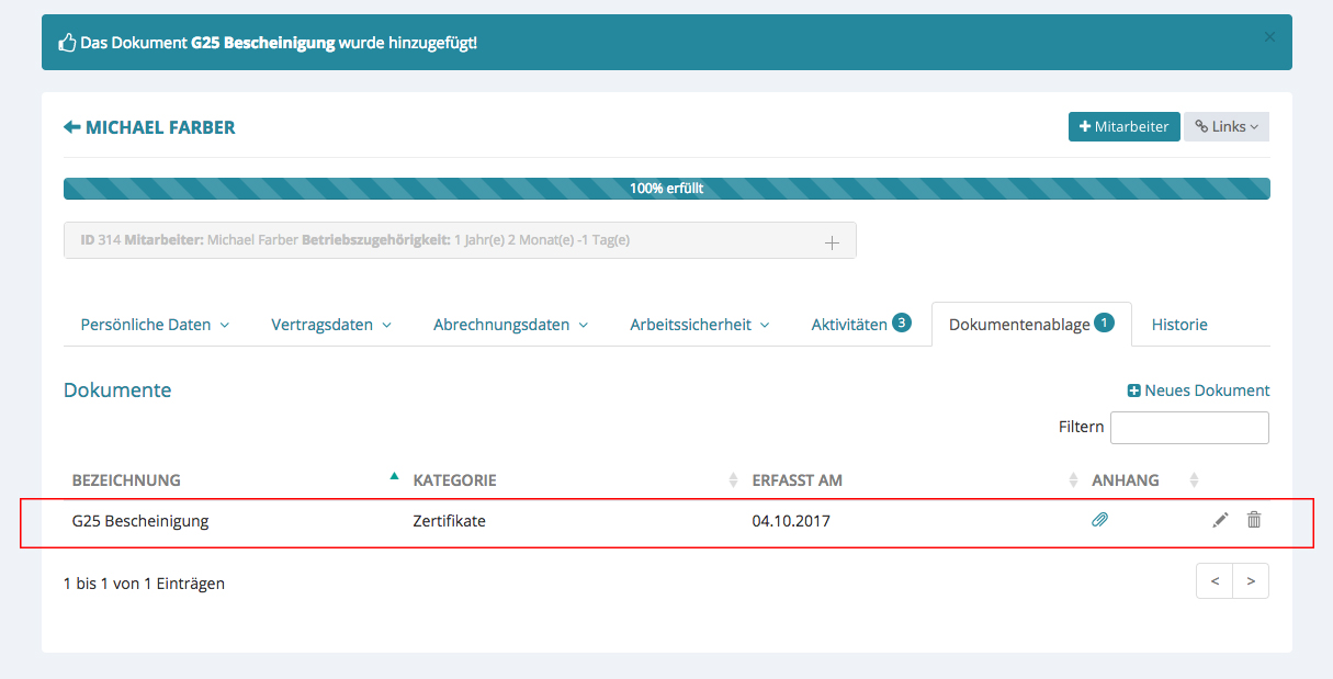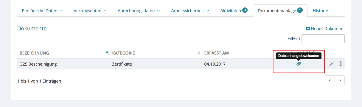 Das Dokument erscheint nun in der Übersicht. Es kann per Klick auf die Büroklammer angesehen werden, mit dem Stift bearbeitet werden und durch den Papierkorb gelöscht werden. Ebenso wird Ihnen neben dem Reiter „Dokumentenablage“ die Anzahl der hinterlegten Dokumente angezeigt.
