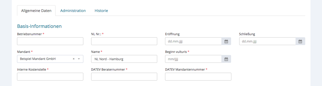 bedeutet, ab welchem Zeitpunkt, die neue Niederlassung mit Vulturis abrechnet wird/wurde. Beispiel: Firma X, rechnet seit 01/2016 seine Mitarbeiter mit Vulturis ab. Im Mai eröffnet ein Stammmandant eine neue NL in Y. Dessen Mitarbeiter werden dann 06/2016 zum ersten Mal mit Vulturis abgerechnet, also lautet der Beginn von NL Y 06/2016.
