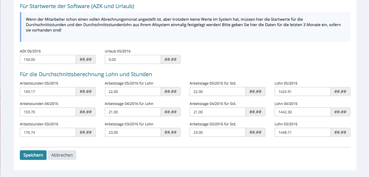 Das Startdatum ist entscheidend für die Mitarbeiterabrechnung, da die Entgeltfortzahlung ab Startdatum drei Monate zurück, nach den Tagessätzen und Durchschnittsstunden errechnet wird. Da diese beim Start noch nicht vorliegen, müssen diese vom Kunden beim Mitarbeiter hinterlegt werden. Betreuung/Mitarbeiter/Mitarbeiter XY/Vertragsdaten/Eintritt