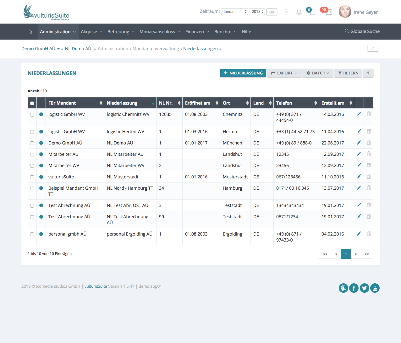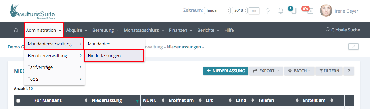 Um zu der Listenansicht der Niederlassungen zugelangen, klicken Sie bitte in der Menüleiste auf Administration -> Mandantenverwaltung -> Niederlassung