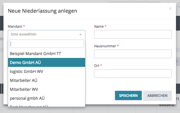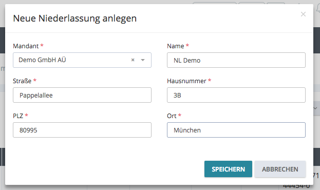Ein Klick auf den Button „+Niederlassung“ und ein Schnelleingabefenster öffnet sich.
