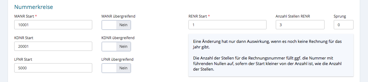 Rechnungsnummern Start, diese Nummer wird vergeben, wenn die 1. Rechnung im Jahr geschrieben wird. Nach dem Jahreswechsel fängt die Zählung von Neuem an, deshalb empfehlen wir eine Änderung dieser Felder erst, wenn die letzte Rechnung im aktuellen Jahr geschrieben ist.