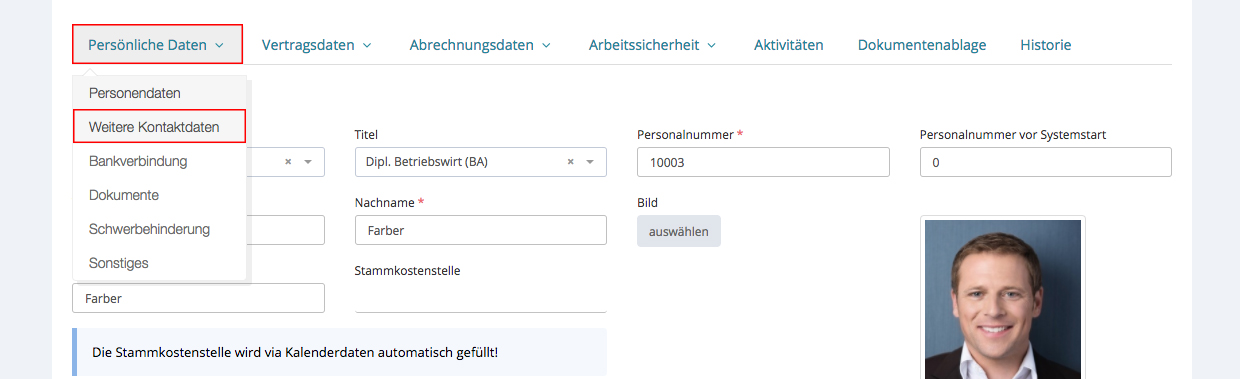 Sind alle Personendaten hinterlegt, klicken Sie bitte auf den Pfeil bei „Persönliche Daten“ und klicken auf „Weitere Kontaktdaten“.