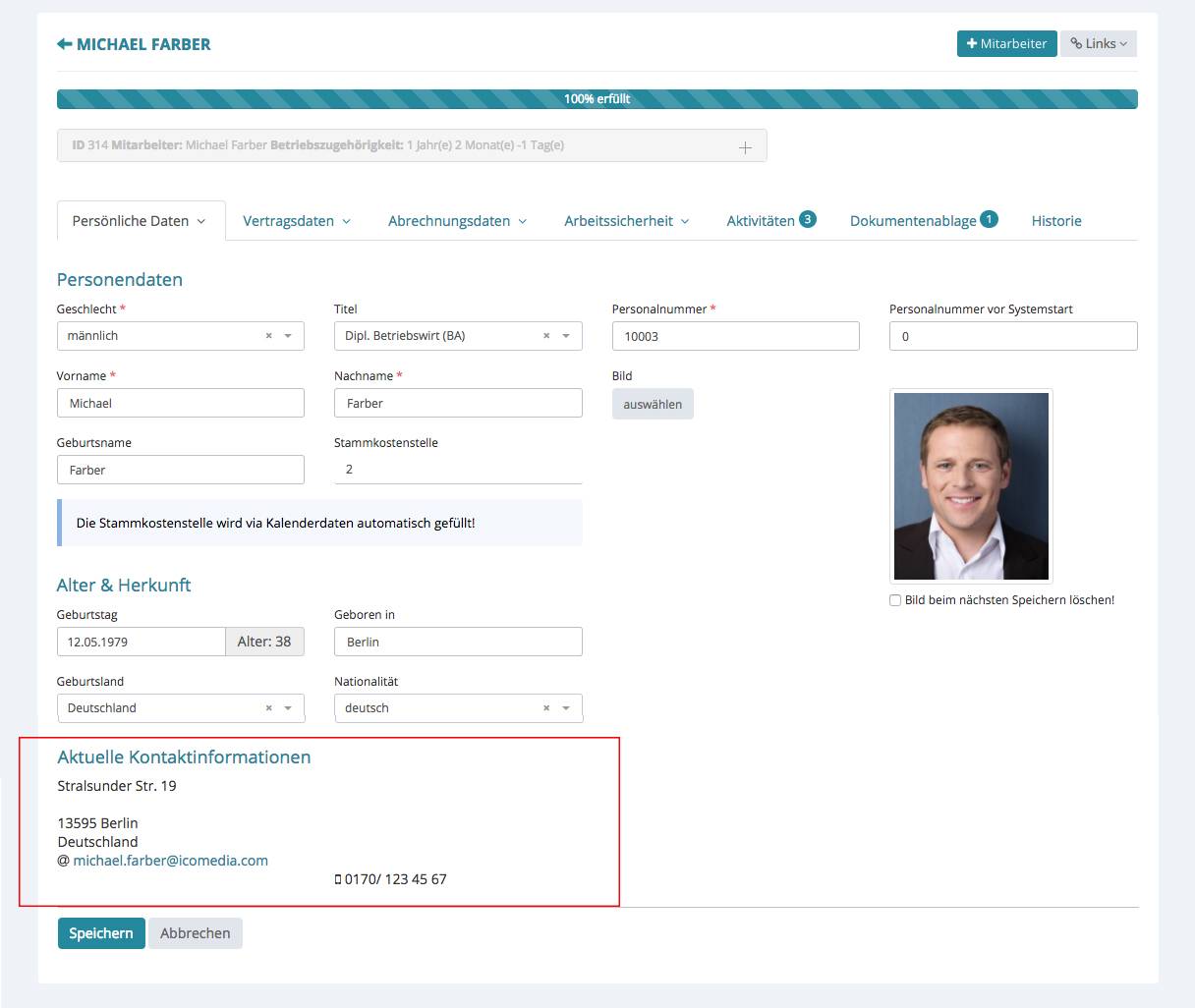 Auf der Personendaten-Seite erscheint nun die Adresse unten.