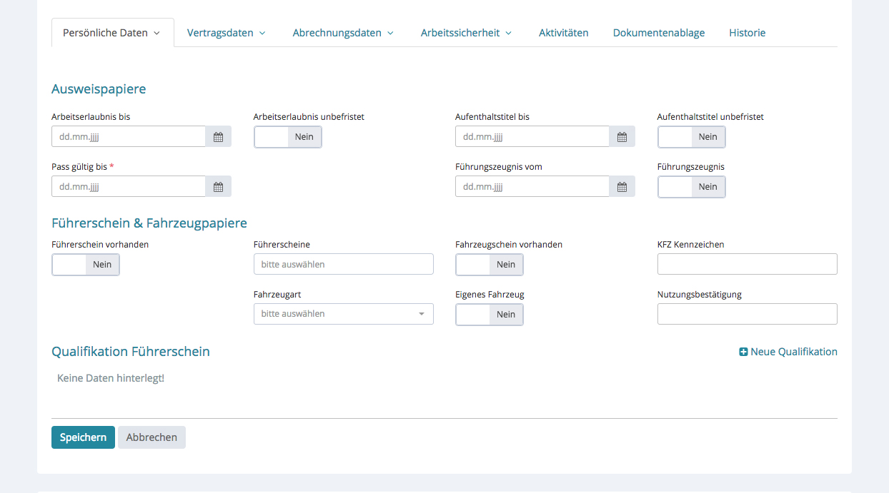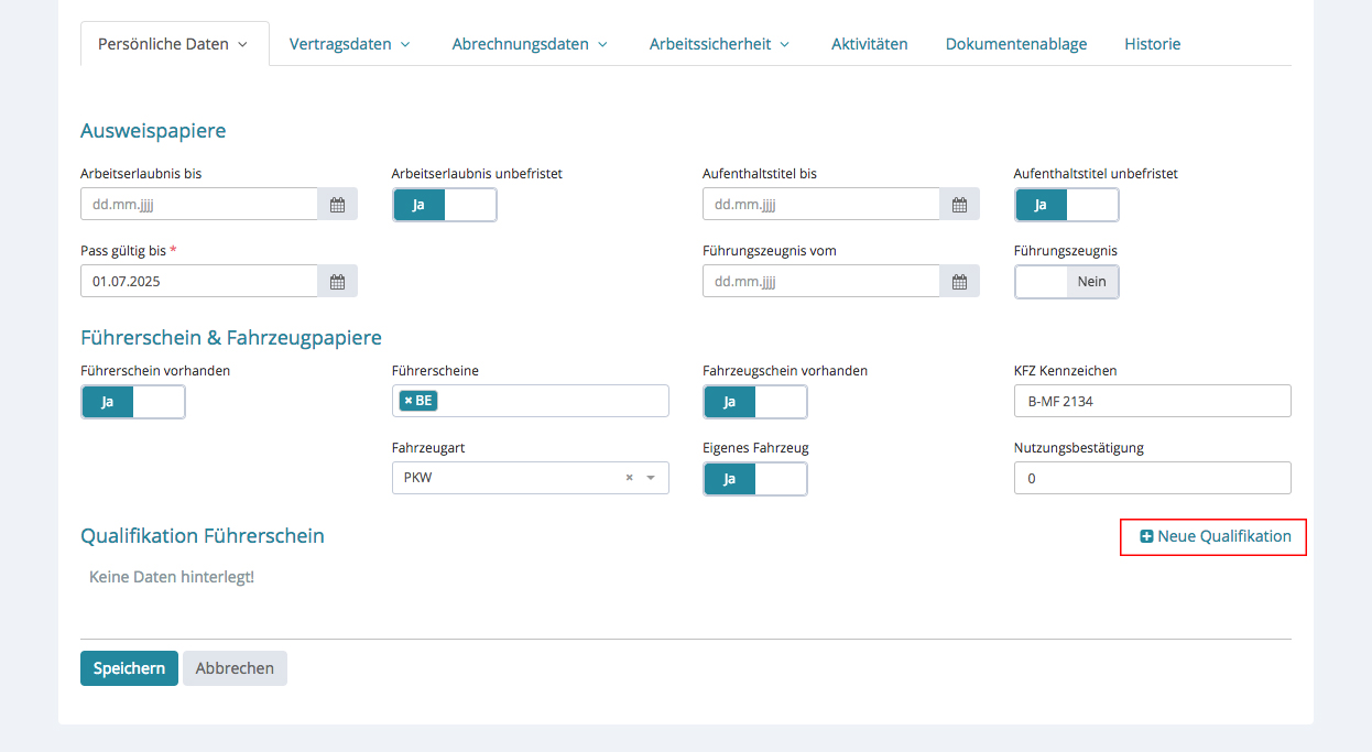 Wenn der Mitarbeiter zusätzliche Führerscheinklassen besitzt, wie z.B. einen LKW-Führerschein der Klasse C, CE, C1 oder C1E, tragen Sie diesen bitte bei „+ Neue Qualifikation“ ein.