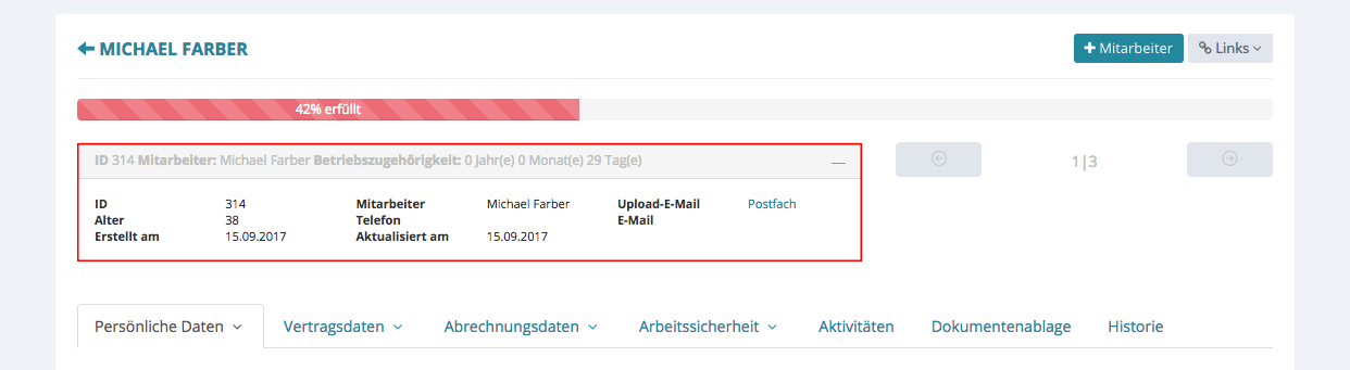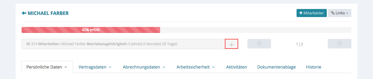 Wie bei jedem Datensatz gibt es auch beim Bewerber eine ausklappbare Übersicht mit wichtigen Eckdaten. Diese kann ausgeklappt werden, indem Sie auf das Plus klicken und wieder zuklappen, idem Sie auf das Minus klicken.
