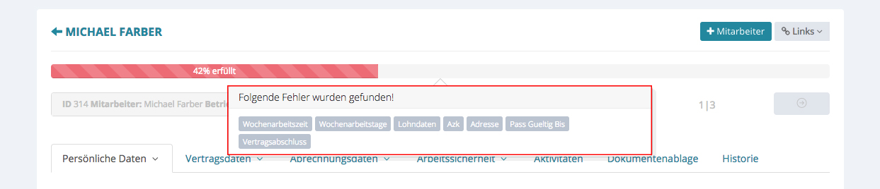 Wenn man mit einem Klick auf den Statusbalken klickt, wird angezeigt, in welchen Bereichen noch Eingaben fehlen, um die 100% zu erreichen. Mit einem weiteren Klick auf den Balken verschwindet dieser Hinweis wieder.