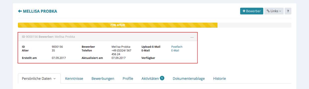 Bewerber- und Kunden-Telefonnummer sowie E-Mail haben im Datensatz jeweils ein Icon erhalten, somit kann direkt via mobilen Device direkt aus dem System heraus angerufen werden.