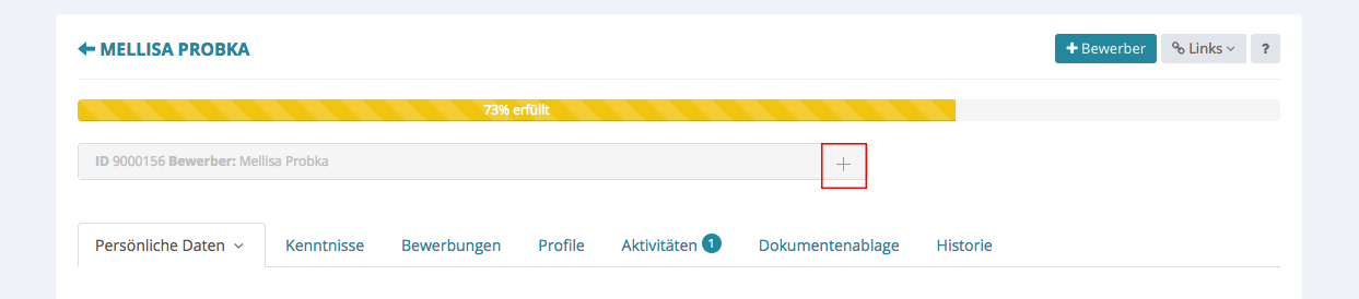 Wie bei jedem Datensatz gibt es auch beim Bewerber eine ausklappbare Übersicht mit wichtigen Eckdaten. Diese kann ausgeklappt werden, indem Sie auf das Plus klicken und wieder zuklappen, idem Sie auf das Minus klicken.