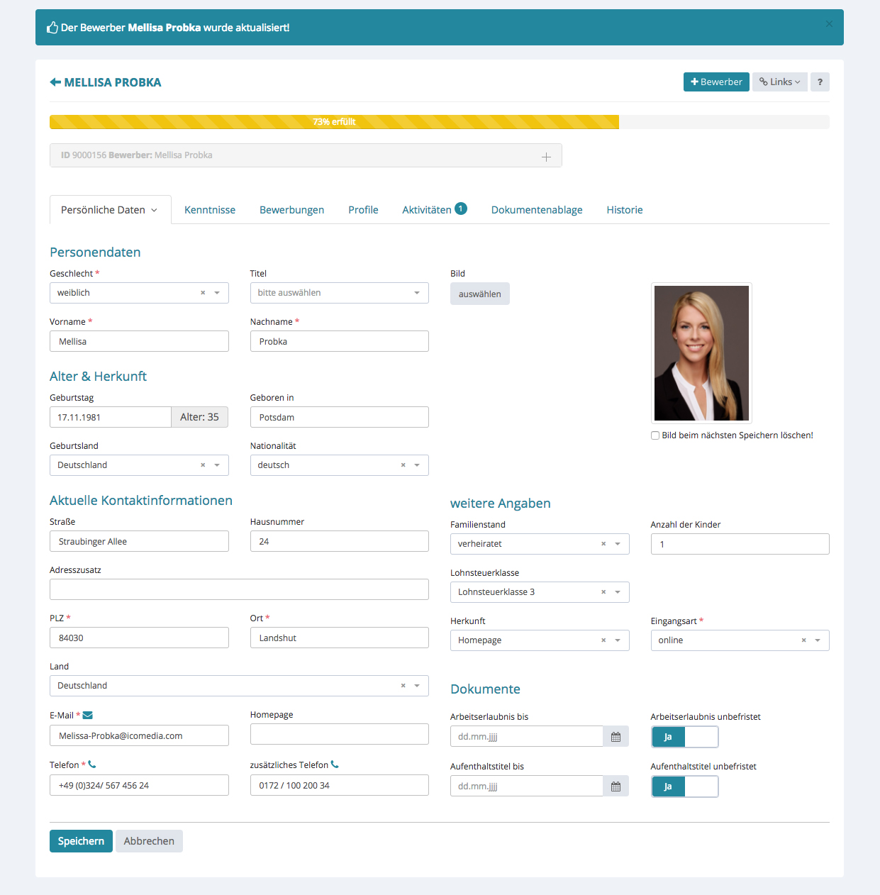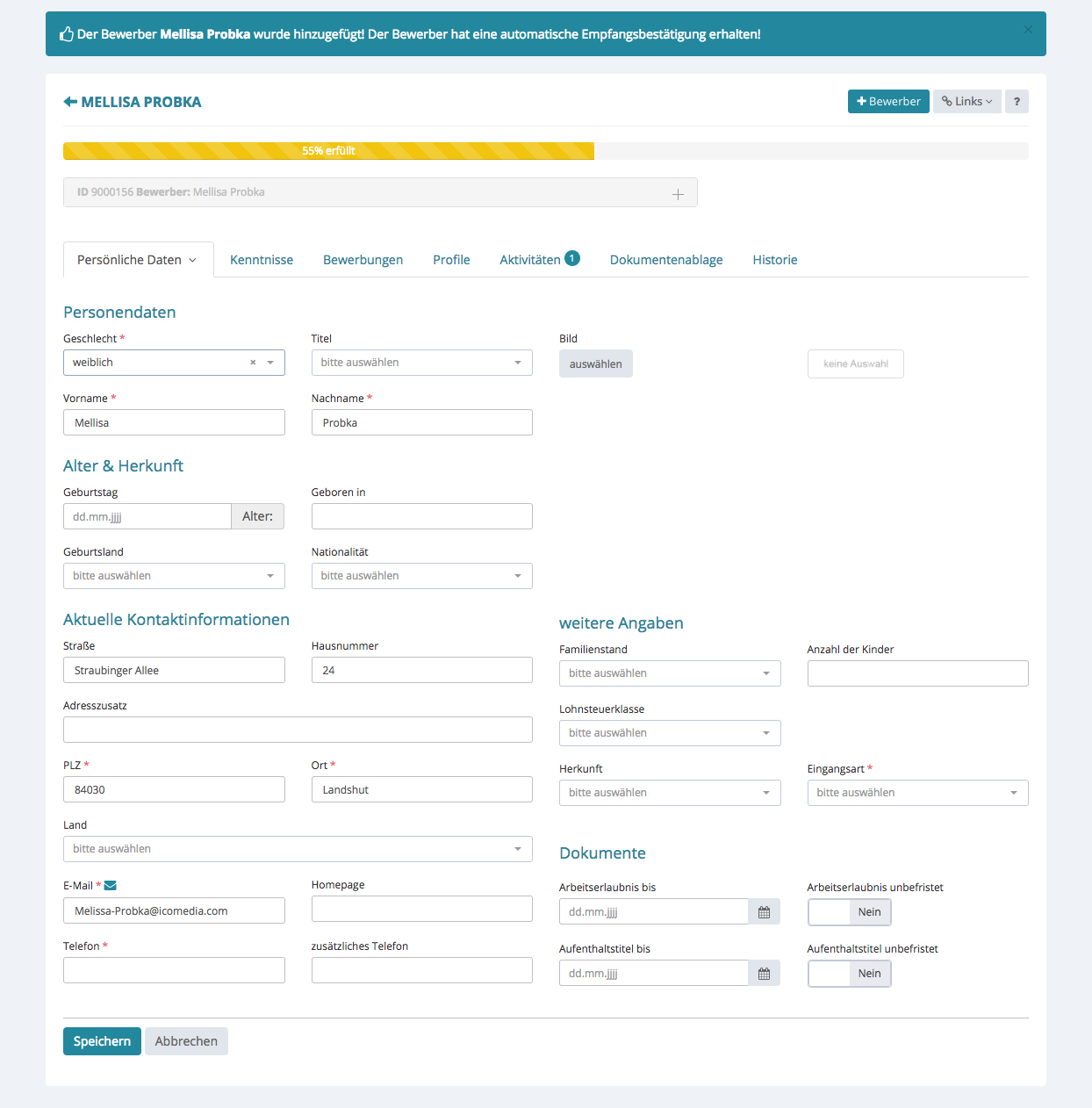 Im Tab „Persönliche Daten“ wurden alle Pflichtfelder ausgefüllt. Es fehlen noch die Daten unter dem Tab „Bewerbung als“ und „Interne Informationen“.