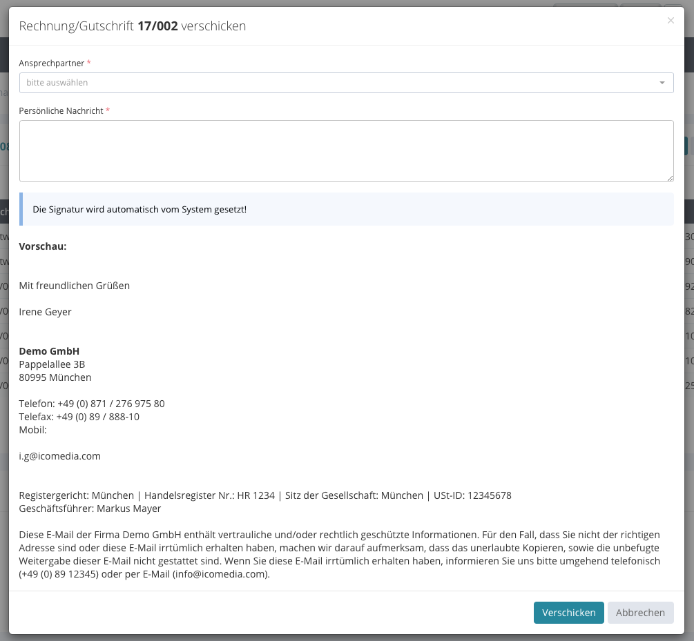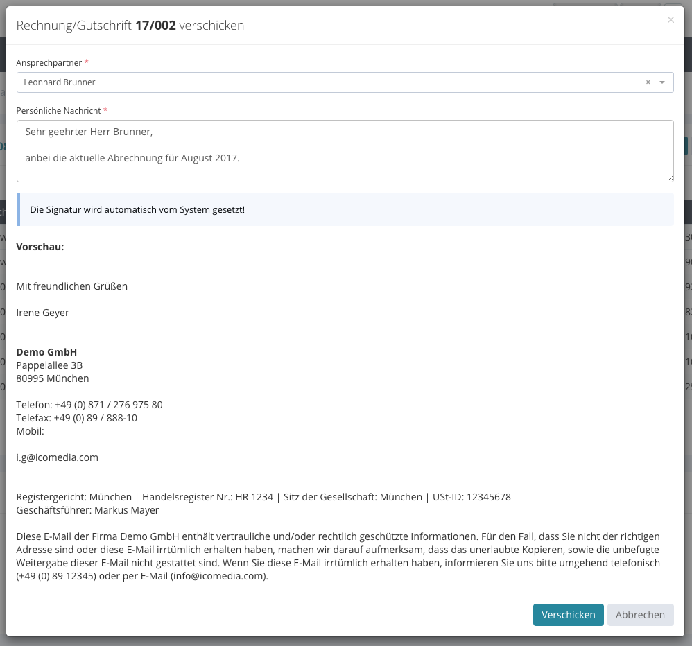 Ein Klick auf den Button „Verschicken“ und die Rechnung/Gutschrift wird versendet.