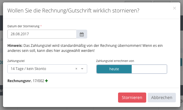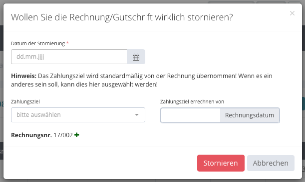 Die Storno Rechnungsnummer wird vergeben und eine Änderung ist nicht mehr möglich.